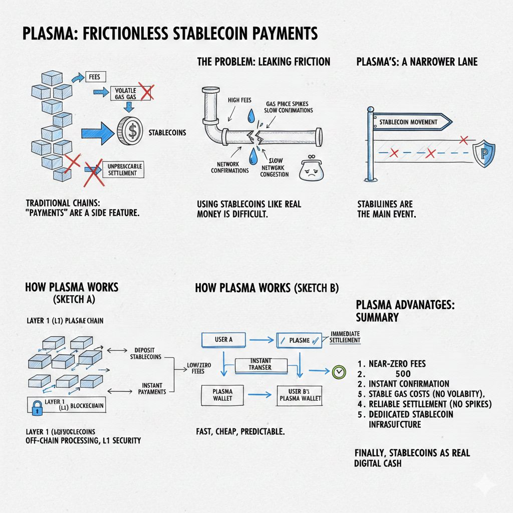 Plasma feels like a project built with a very specific frustration in mind, because almost every chain says it can support payments, yet the moment you try to use stablecoins like real money, the experience starts leaking friction through fees, volatile gas tokens, and unpredictable settlement when activity spikes, so Plasma chooses a narrower lane on purpose and treats stablecoin movement as the main event instead of a side feature that sits behind general purpose DeFi traffic.