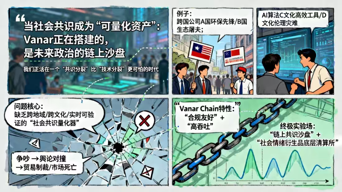 而我最近盯着Vanar Chain的一系列动向,尤其是它那个被市场严重低估的 “合规友好”+“高吞吐”特性,脑子里突然冒出一个极其大胆、甚至有点政治不正确的想法:Vanar这玩意儿,或许根本就不是给下一个“加密猫”或者“Uniswap仿盘”准备的。它的终极实验场,可能是一个我们从未想象过的领域——成为全球性议题的“链上共识沙盘”和“社会情绪衍生品”的底层清算所。