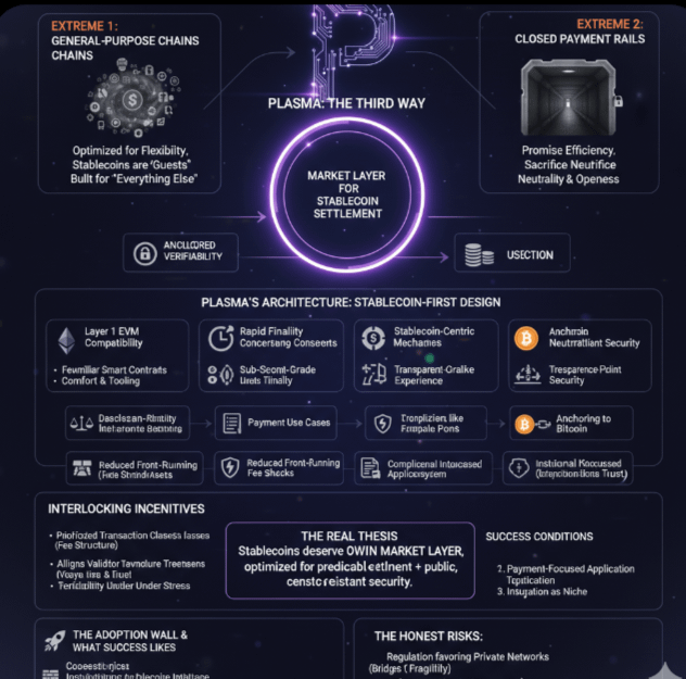 The industry has drifted into two extremes. On one side are general-purpose chains optimized for flexibility, where stablecoins are guests inside systems built for everything else. On the other side are closed payment rails that promise efficiency but sacrifice neutrality and openness. Plasma positions itself as a third way: a market layer engineered specifically for stablecoin settlement, but anchored to public verifiability. It treats stablecoins not as an application, but as the organizing principle of the system.