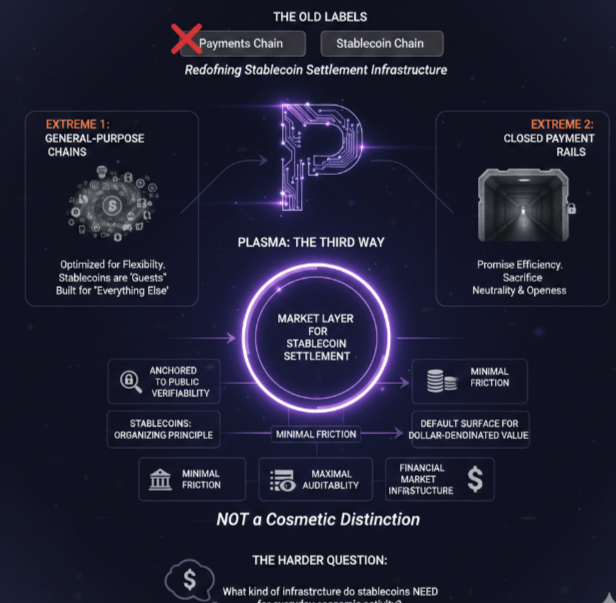 Most people call Plasma a payments chain. That label is too small and quietly misleading. Plasma is not trying to be another fast blockchain competing on speed charts; it is trying to redesign how stablecoins settle in public markets. The harder question is this: what kind of infrastructure do stablecoins actually need if they are going to carry everyday economic activity, not just speculative trades?