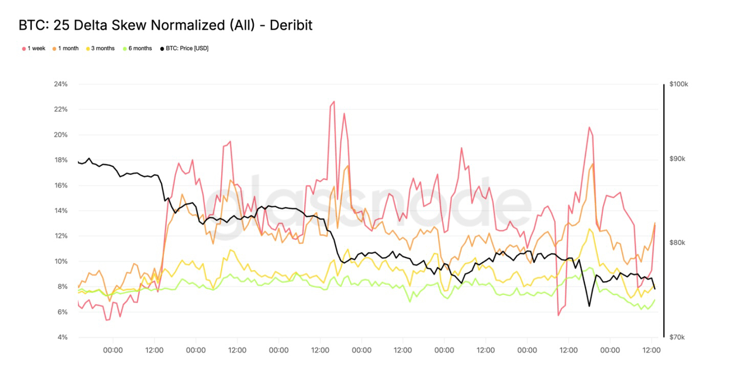 第二,看跌期权需求持续增加。看跌期权相对看涨期权的偏斜度再次扩大,哪怕价格守在73000美元上方,资金还是集中买看跌期权做保护,市场的防御性特别浓。