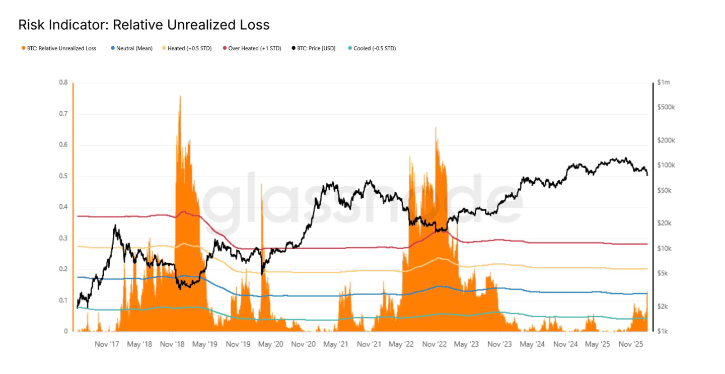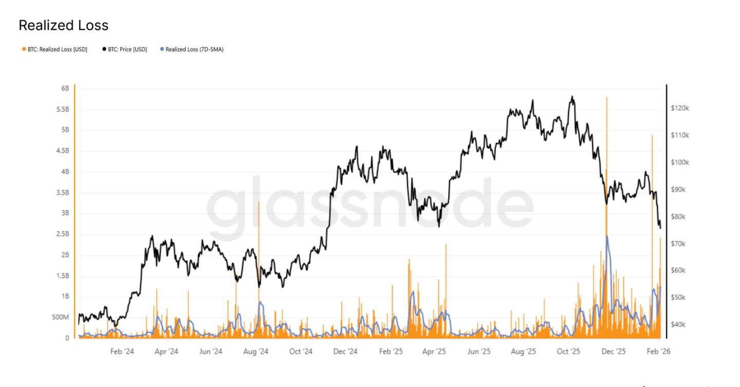 现在市场最明显的特征,就是“认赔出局的人越来越多”。链上的已实现亏损指标很直观:7日平均已实现亏损已经超过每天12.6亿美元,跌破关键支撑后,恐慌性抛售明显增加。