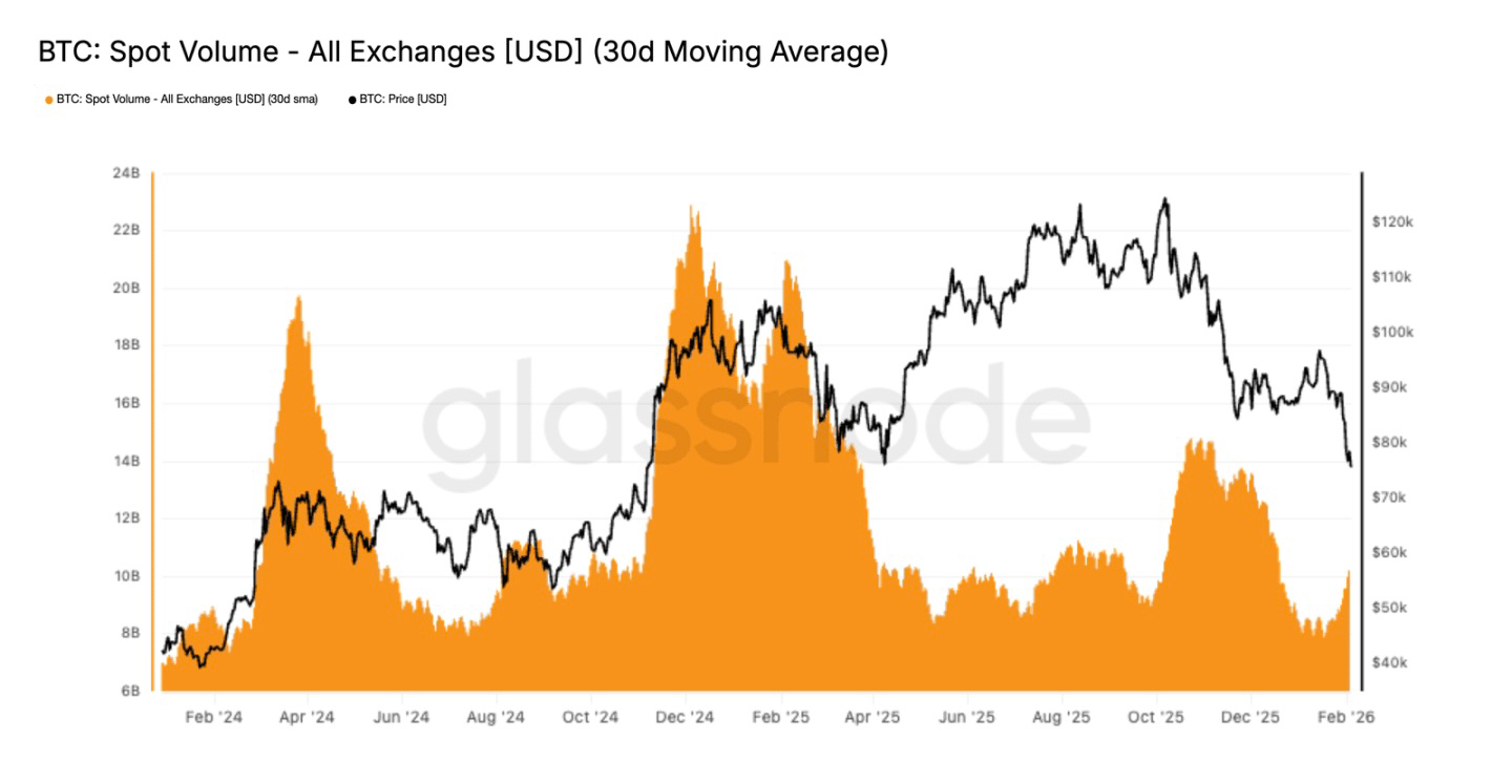 首先是现货交易量持续低迷。价格从98000跌到72000,跌了26000美元,但30天平均交易量根本没放大。历史上,真正的趋势反转,一定伴随现货交易量显著放大——因为有新资金大规模入场接盘。现在交易量只是小幅回升,说明大家都在减仓避险,没人敢主动建仓,流动性不足,哪怕中等规模的卖出,都能引发大跌。