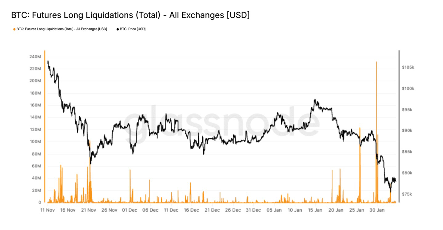 其次是期货市场强制去杠杆。这次下跌,衍生品市场出现大规模多头平仓,创下本轮下跌以来最高纪录。之前11-12月,平仓还比较温和,杠杆在慢慢重建,现在突然激增,说明市场进入“强制去杠杆”阶段——杠杆多头被平台强制卖出,被动砸盘,加剧了下跌动能。