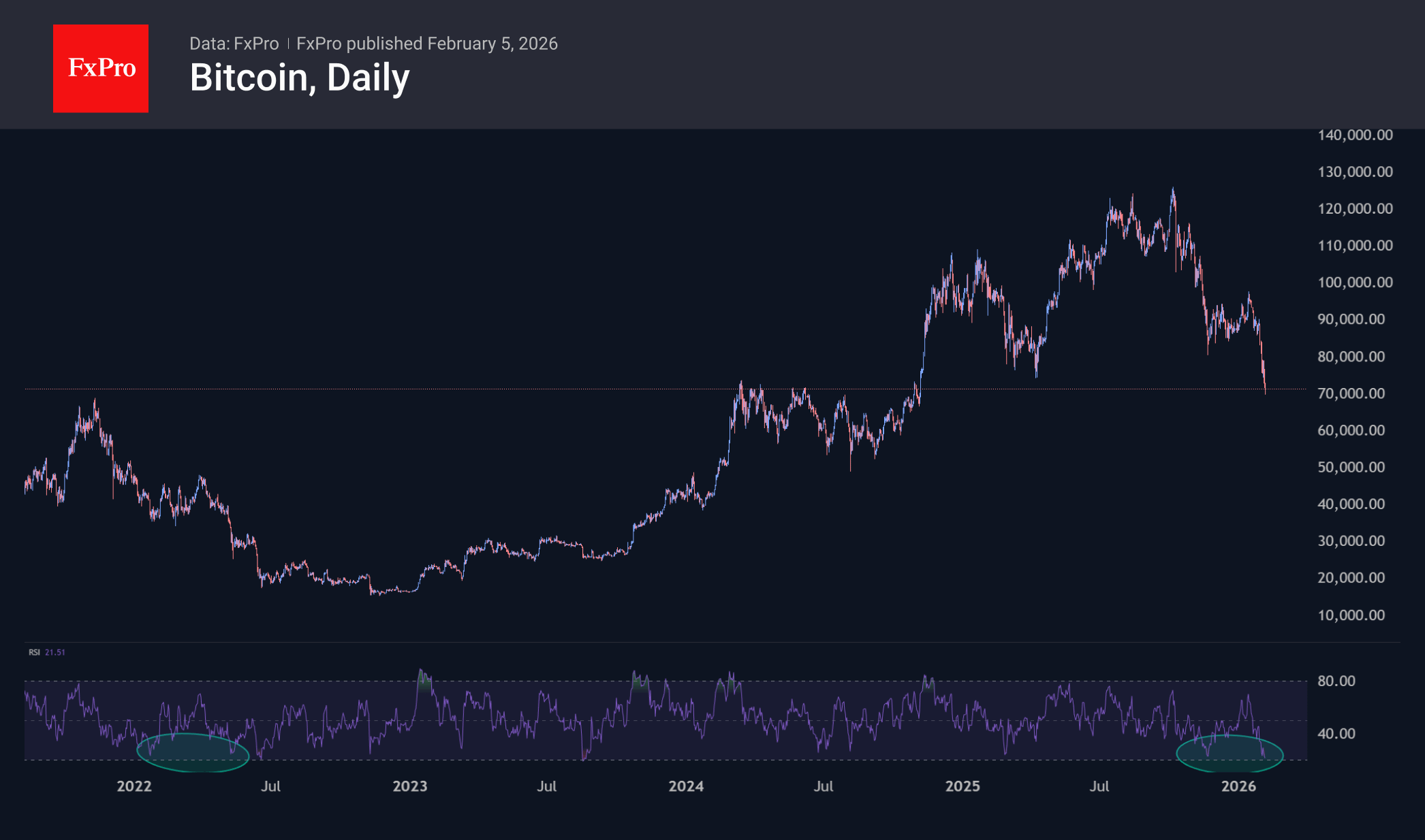 Bitcoin’s decline accelerated, pulling its price down to around $71,000 despite entering oversold territory. The cryptocurrency has now fallen back to a zone that acted as strong resistance throughout much of 2024, attracting some bargain hunters. Although technical indicators suggest the sell-off is extreme, fears of continued losses remain — especially with nearly half of all Bitcoin holdings currently underwater. Some analysts caution that a drop toward $60,000 is possible if historical bear market patterns repeat, though increased institutional involvement may help cushion further falls.