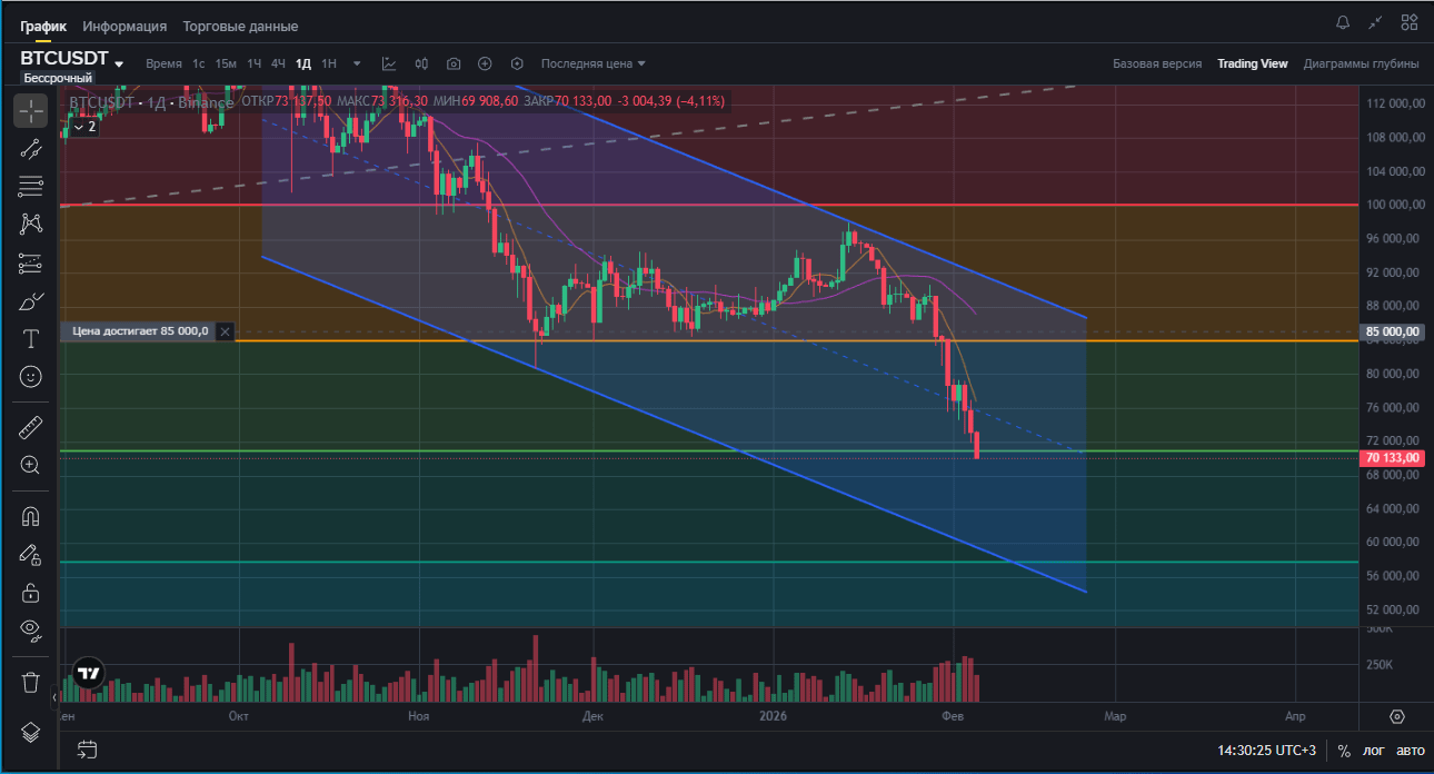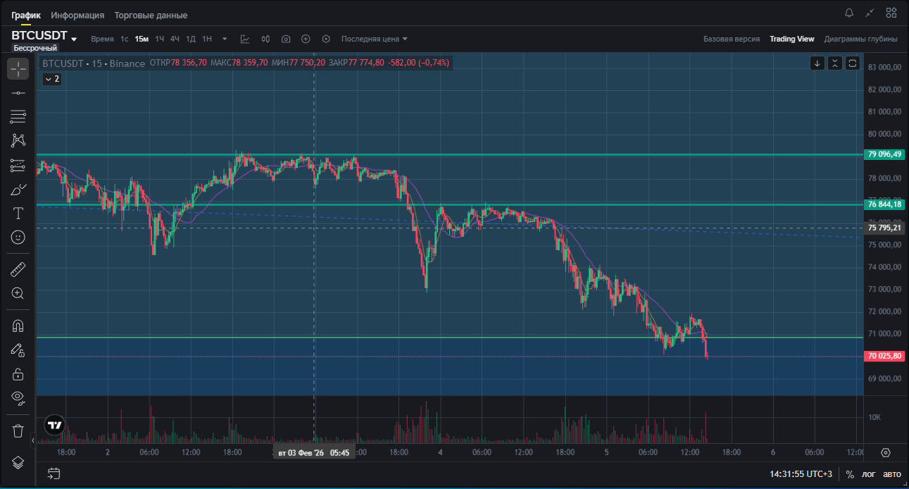 Vedem că la 84500, 71100, 76800 au fost mari tranzacții, care s-au terminat cu distrugerea stopurilor celor lungi și o cădere ulterioară. Pe 02.02.2026 a fost o încercare de a cumpăra, dar nu ne-au lăsat să urcăm peste 79, iar la cumpărători le-a terminat combustibilul. La fel și pe 3 la 21-30, doar că aici nu ne-au lăsat să urcăm peste 76800...
