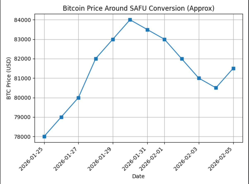 The price of Bitcoin did not spike when the announcement was made. Indeed it went over sideways and even a little down in the first days of the conversion. The figure below illustrates a rough price movement towards the end of January and the first half of February 2026.