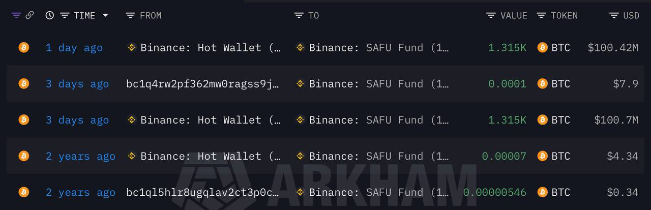 The blockchain reveals that Binance moved 1,315BTC (approximately 100 million dollars) to the SAFU wallet. This is not a promise but some evidence of execution.