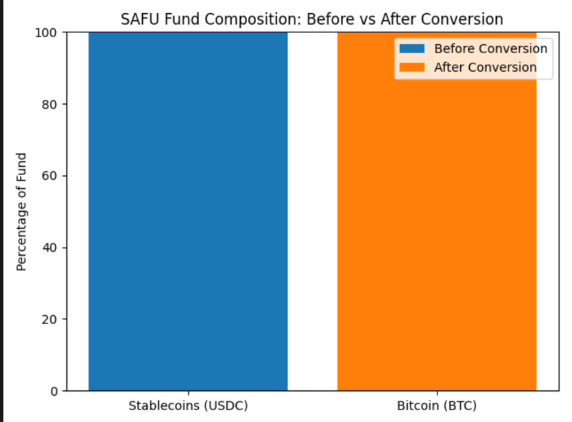 The former chart is a comparison of the composition of the fund prior to the conversion and after. Prior to the announcement, SAFU had nearly a hundred percent of stablecoins (USDC) and a minor quantity of BTC. Once the conversion, it will be 100 per cent BTC.