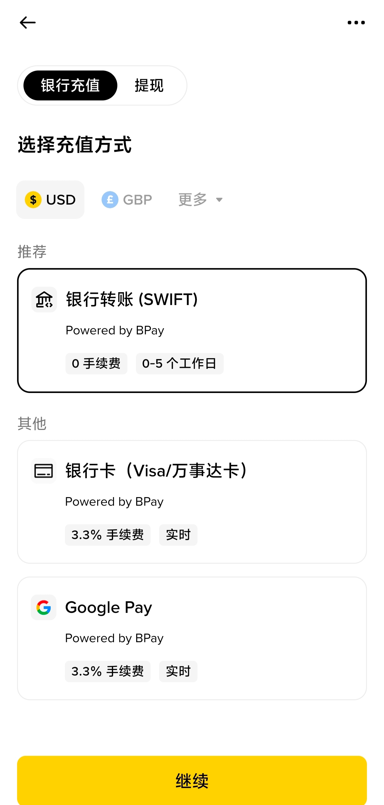 通过银行swift转账可以免除手续费,如果通过银行卡、Apple Pay和Google Pay需要收取手续费。