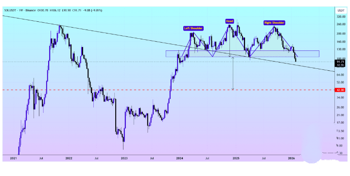 Para que lo entiendan clarito: imaginen que Solana vivía en un penthouse de entre $120 y $250. Ahora, se cayó del edificio y está tratando de no hundirse en el sótano. El problema técnico es que se acaba de confirmar un patrón de "Hombro-Cabeza-Hombro" en el gráfico semanal. 📊 Este es uno de los indicadores más temidos por los analistas porque suele preceder a desplomes masivos. La "línea de cuello" de este patrón estaba en los $105, y como cerramos enero por debajo de eso, esa zona que antes era nuestro piso, ahora se convirtió en un techo de concreto muy difícil de romper.