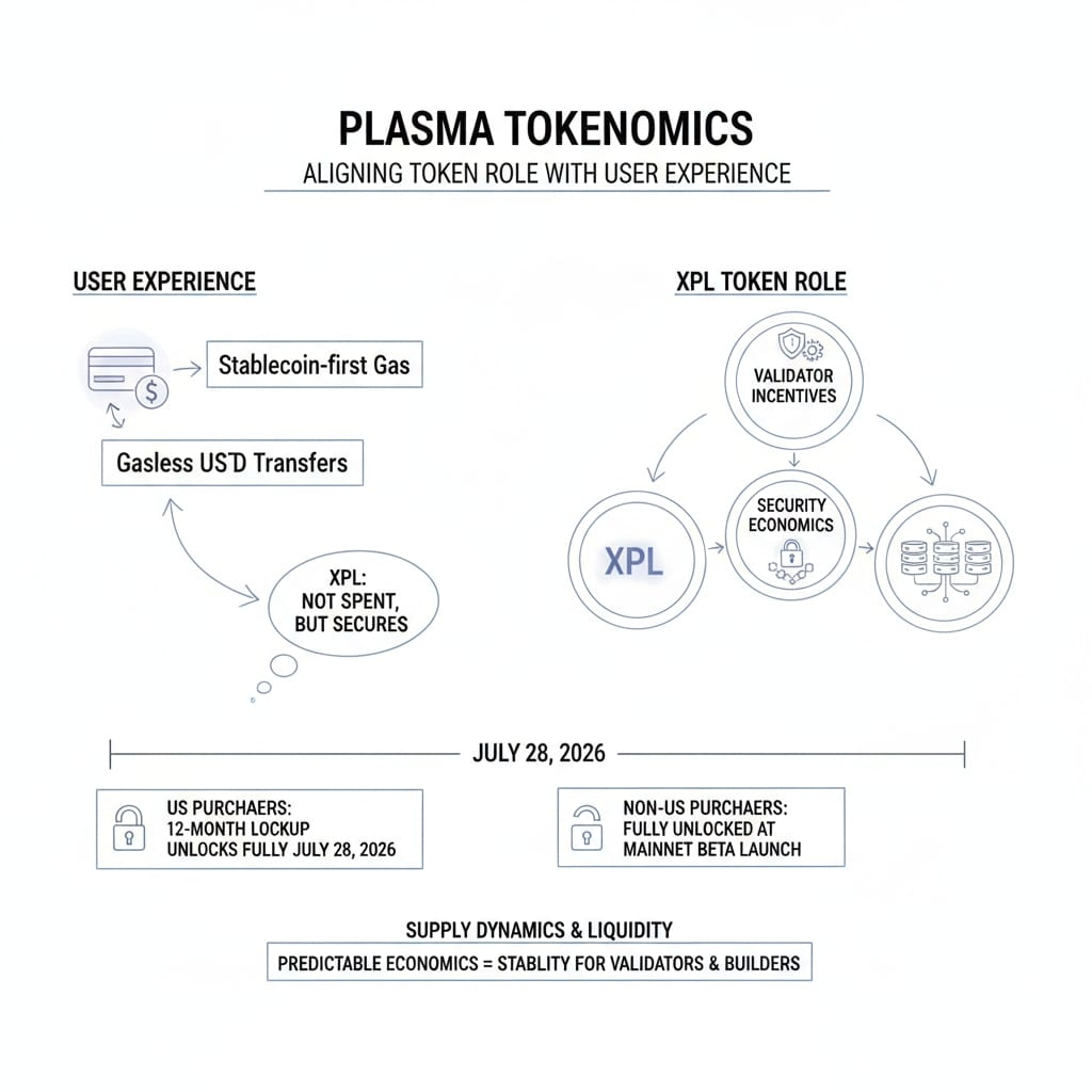 On the token side, I don’t think the most important story is price or hype. It’s whether the token’s role aligns with the chain’s intended user experience. If Plasma really succeeds at stablecoin-first gas and gasless USDT transfers, then XPL shouldn’t feel like “what users spend.” It should feel like “what keeps the rails honest”: validator incentives, security economics, and network operations. Plasma’s tokenomics docs also give a concrete timeline detail that matters for anyone watching supply dynamics: XPL purchased by US purchasers is subject to a 12-month lockup and will be fully unlocked on July 28, 2026, while non-US purchasers are fully unlocked upon launch of the Plasma Mainnet Beta.