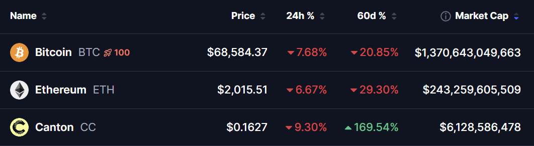 Piața crypto mai largă rămâne sub presiune, cu Bitcoin (BTC) și Ethereum (ETH) scăzând cu mai mult de 20% și 29% în ultimele 30 de zile. Această ondă de vânzări a tras majoritatea altcoin-urilor în jos, dar Canton (CC) s-a remarcat ca un performer rar, înregistrând o rally puternică de 169% înainte de a intra într-o corecție pe termen scurt.