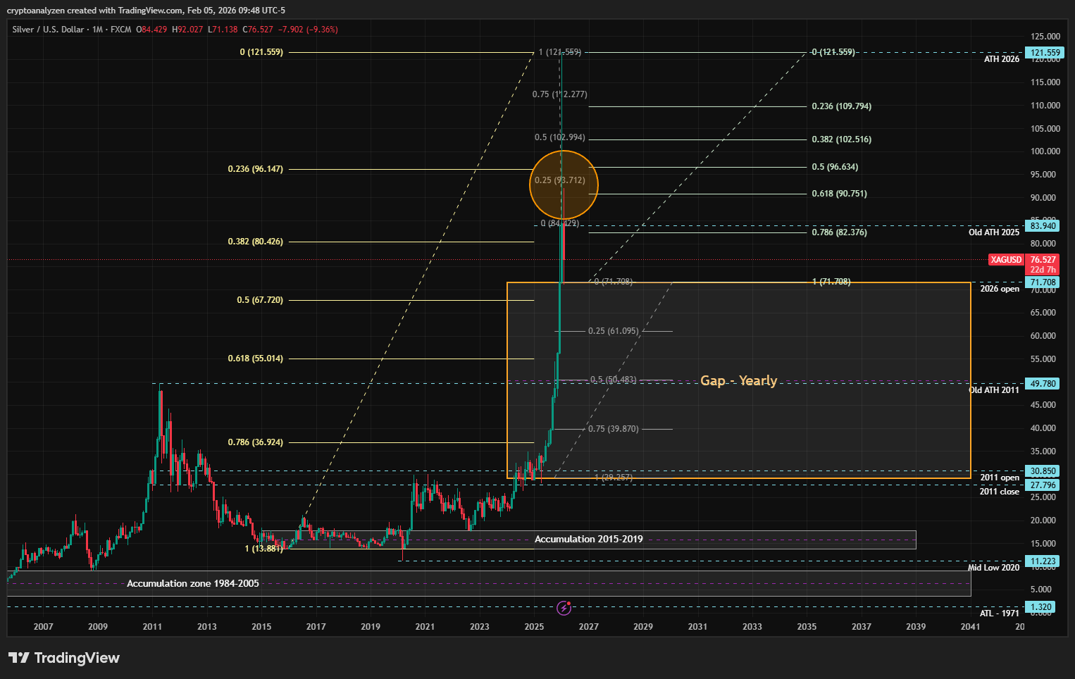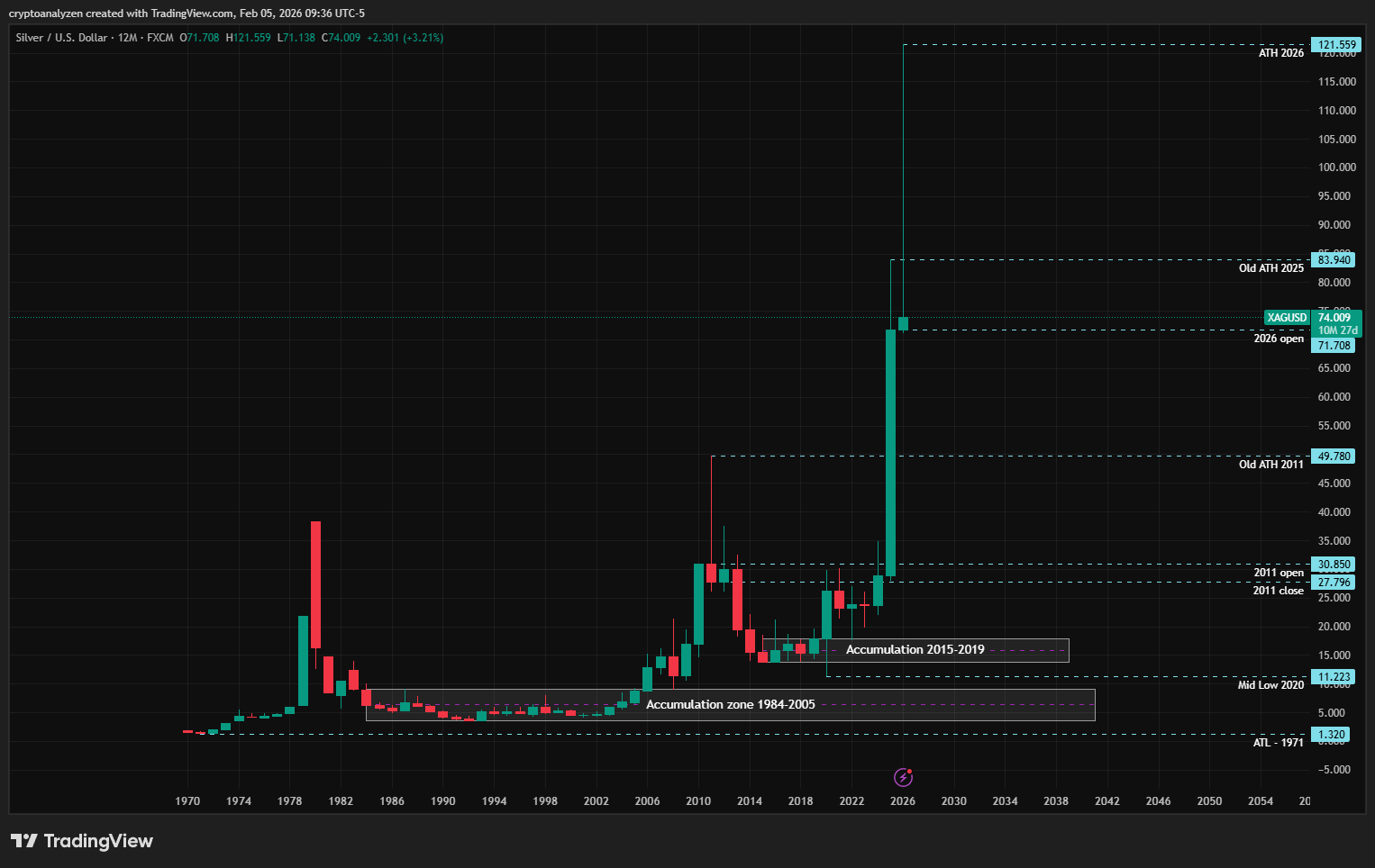 📌 In January 2026, the rally continued due to strong public FOMO, and a new all-time high at 121.559 was formed.