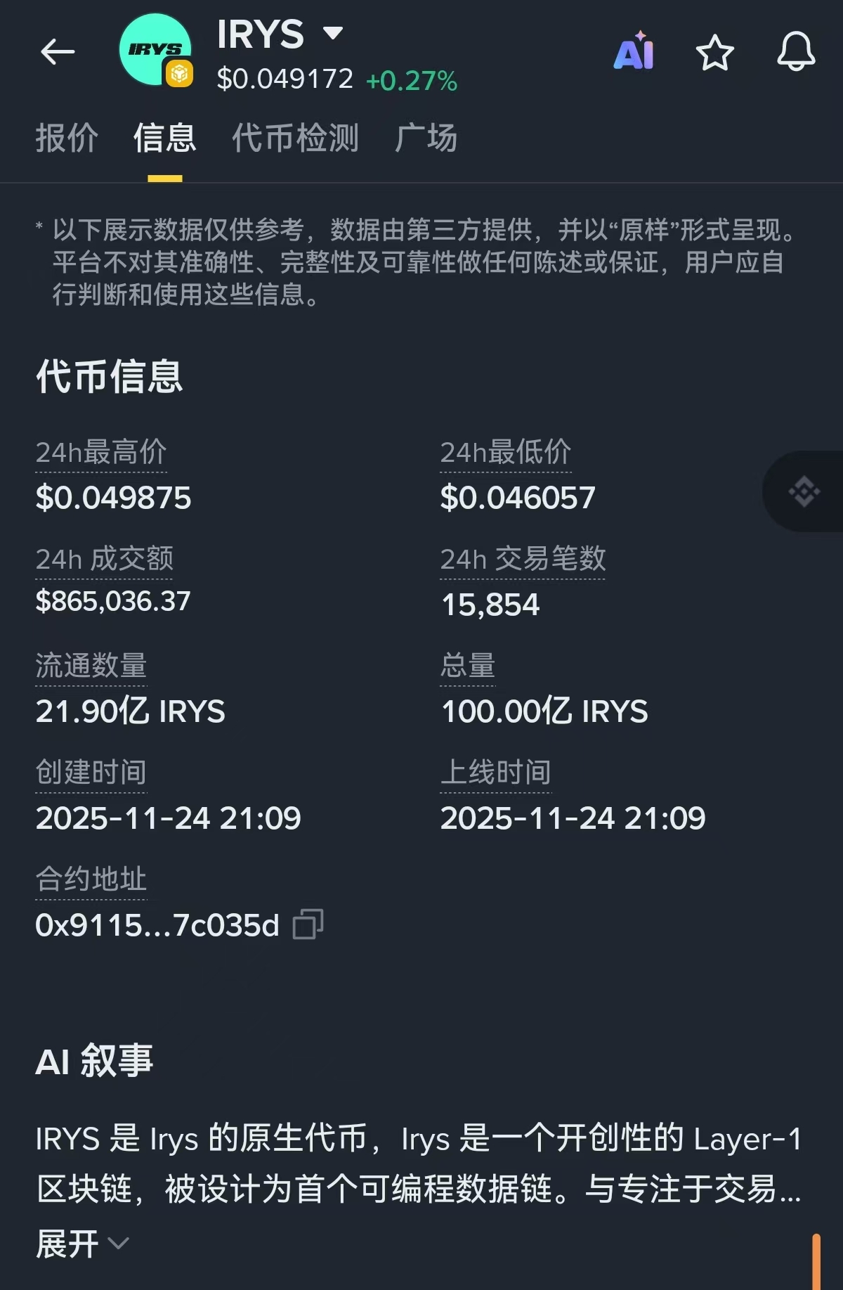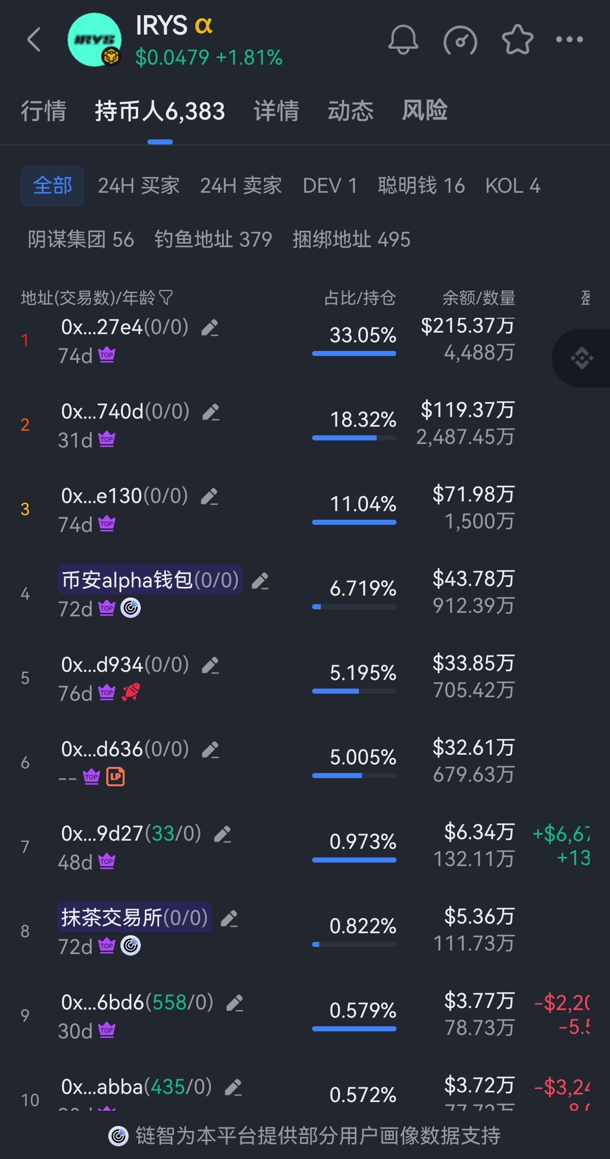 • IRYS当前价 $0.0479,24小时涨 +1.81%,持币地址数 6,383 个。