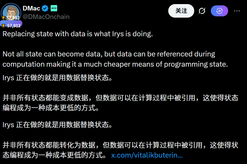 Irys 的逻辑很简单粗暴:把存储和计算在一起。据说能让合约以毫秒级的速度直接读取链上的数据。“热访问”这一块能力一流,可以随时调用数据?