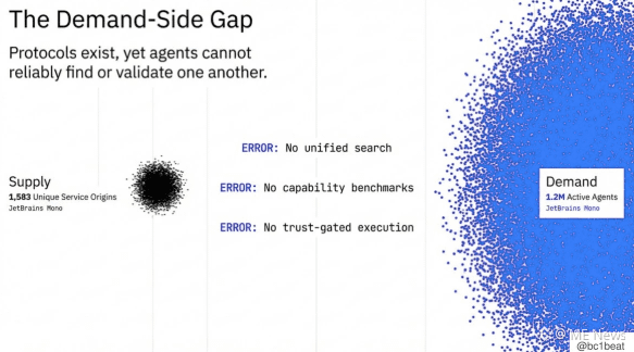 当前代理经济中最大的机会,来自需求侧的空白。目前供给侧已有 1,583 个独立服务来源,而需求侧则聚集了约 120 万个活跃代理。两者之间存在三个关键断层:没有跨平台的统一搜索机制;没有能力基准来证明代理究竟“能做什么”;也没有将 ERC-8004 的信任验证与 x402 支付执行连接起来的信任门控机制。协议已经存在,但产品层尚未出现。