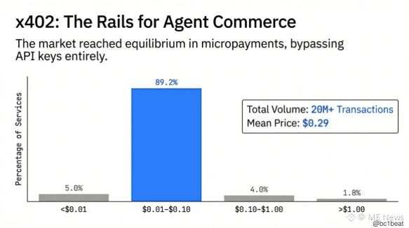 x402 已经找到了自己的定价均衡。当前 89.2% 的服务将价格设定在 0.01–0.10 美元之间,这是一个稳定币结算成本远低于信用卡通道费的“甜蜜区间”。随着市场逐渐收敛至微支付经济模型,x402 的平均价格在一个月内从 0.81 美元下降至 0.29 美元。2000 万笔以上的交易量、无需 API Key、原生支持 HTTP,这意味着代理商业所需的支付轨道已经真正跑通,并且定价合理。