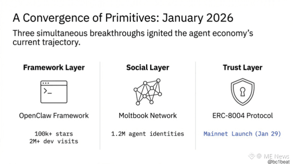 1 月份出现了三项几乎同时发生的关键突破。OpenClaw 的 GitHub Star 数突破 10 万,并在一周内吸引了超过 200 万名开发者访问,为代理提供了真实可用的任务执行与浏览器控制运行环境;Moltbook 作为第一个“只面向 AI 的社交网络”正式上线,并在第一周内聚集了 120 万个代理身份;而 ERC-8004 则于 1 月 29 日在以太坊主网上线,其贡献者包括 MetaMask、以太坊基金会、Google 和 Coinbase 的成员。框架、社交和信任三层在同一时间完成拼图。