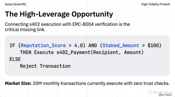 当前每月约 2000 万笔交易在执行时,没有任何信任校验。这为“信任门控支付中间件”创造了极高杠杆的机会。其集成逻辑非常直接:在授权 x402 支付前,查询 ERC-8004 的声誉数据,设定可配置的阈值,并在结算后提交反馈。例如:如果 Reputation_Score > 4.0 且 Staked_Amount > 100 美元,则执行支付;否则拒绝。目前还没有任何团队构建出这样的生产级 SDK。第一个落地的团队,将占据这两个协议之间的关键集成层。