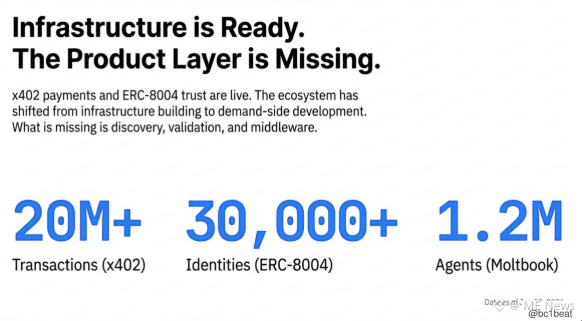基础设施已经就绪,但产品层仍然缺席。随着 x402 支付协议和 ERC-8004 信任协议正式上线,整个生态正在从“搭基础设施”的阶段,转向“构建需求侧产品”的阶段。超过 2000 万笔交易已经通过 x402 完成,ERC-8004 上铸造了 3 万多个代理身份,Moltbook 上注册了约 120 万个代理。协议本身已经被验证可以正常运行,真正缺失的是发现机制、能力验证以及将这些协议连接起来的中间件层。