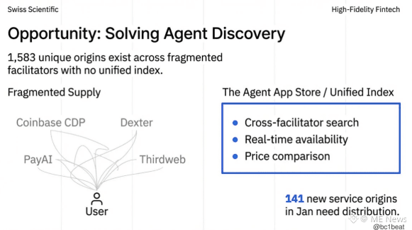 目前代理要寻找服务,必须分别查询 Coinbase CDP、Dexter、PayAI Network 和 thirdweb,每个平台都有不同的 API 和返回格式。仅在 1 月,就有 141 个新服务上线,却缺乏有效的分发渠道。真正的机会在于构建一个统一索引层:跨平台搜索、实时可用性、价格对比——一个“代理版 App Store”。谁能构建出决定性的发现体验,谁就会成为代理商业的入口。