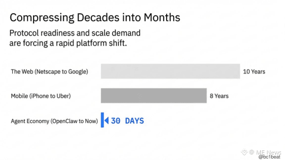 历史上的平台迁移周期往往以十年计:Web 从 Netscape 到 Google 用了 10 年,移动互联网从 iPhone 到应用全面普及用了 8 年。而代理经济在 30 天内完成了支付、信任、社交和开发框架的完整基础设施拼装。协议成熟度与规模化需求正在把数十年的平台演进压缩成数月,需求侧构建者的窗口期已经打开。