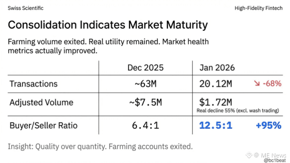 从表面数据来看,情况并不乐观:交易笔数下降 68%,交易量下降 77%。但真正重要的是背后的整合过程。Artemis 的分析显示,12 月份约 47% 的交易量来自非自然的“刷量行为”,剔除这部分后,实际下降幅度更接近 55%。与此同时,买卖双方比例几乎翻倍,从 6.4:1 提升至 12.5:1。刷量账户退出,真实需求留下,每一个存活下来的服务提供者正在服务更多真实用户,这是一次典型的“质量替代数量”。
