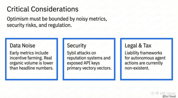 乐观情绪需要保持克制,有三个关键风险需要正视。其一是数据噪音,早期指标中仍包含激励刷量,真实有机交易规模低于头部数据;其二是安全问题,针对声誉系统的女巫攻击以及 API Key 泄露仍是主要攻击向量,Moltbook 已经出现相关事件;其三是法律与税务,针对自主代理行为的责任归属框架尚不存在。构建者应当以对抗性环境为前提设计系统,而非假设理想状态。