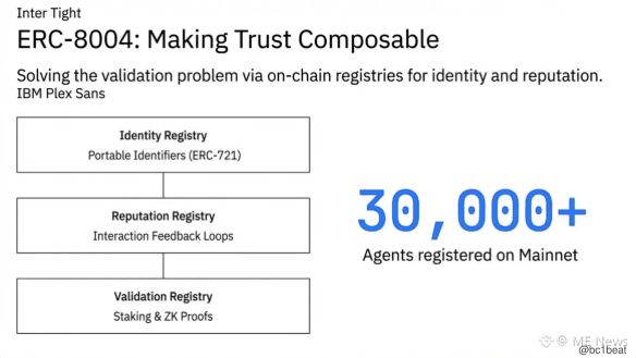 ERC-8004 的核心价值在于让信任成为可组合的模块。它由三个链上注册表共同构成:基于 ERC-721 的身份注册表,为代理提供可携带、抗审查的身份标识;记录每次交互反馈的声誉注册表;以及支持多种信任模型的验证注册表,从简单的质押机制到零知识证明都可以接入。目前已有超过 3 万个代理在主网上完成注册,信任基础设施已经存在,真正的问题在于它能以多快的速度被采用。