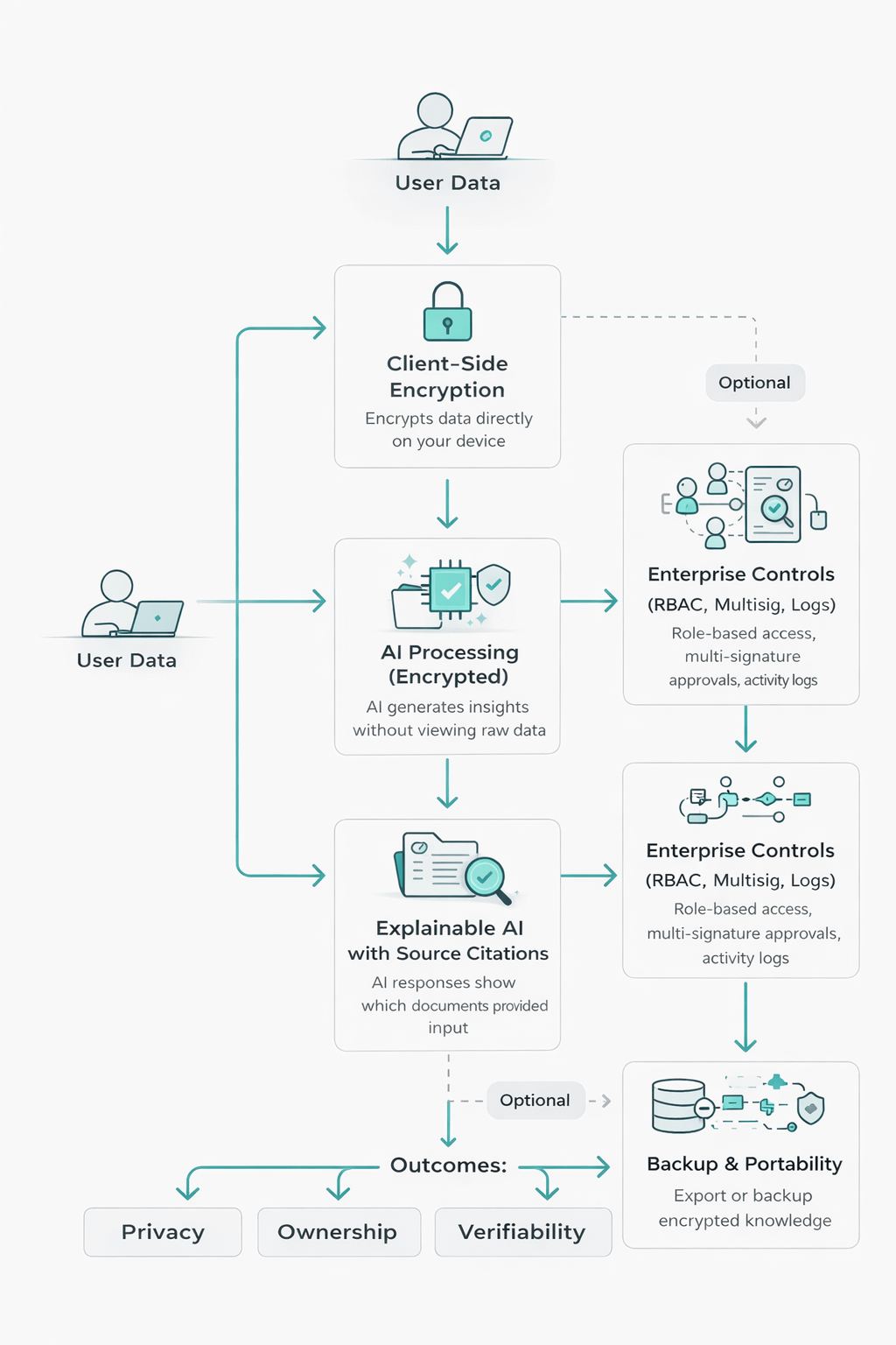 Backup and portability features ensure encrypted knowledge can be exported or recovered at any time, preventing vendor lock-in a common risk with centralized AI services.