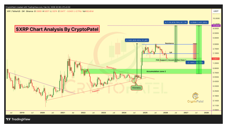 În prezent, tranzacționându-se la 1,42 USD, #XRP se află în cadrul primei zone de acumulare a lui Patel. Cu toate acestea, el nu recomandă intrări agresive la acest nivel. În schimb, el sugerează acumularea treptată, deoarece retragerile puternice necesită adesea timp pentru a forma fundamente durabile.