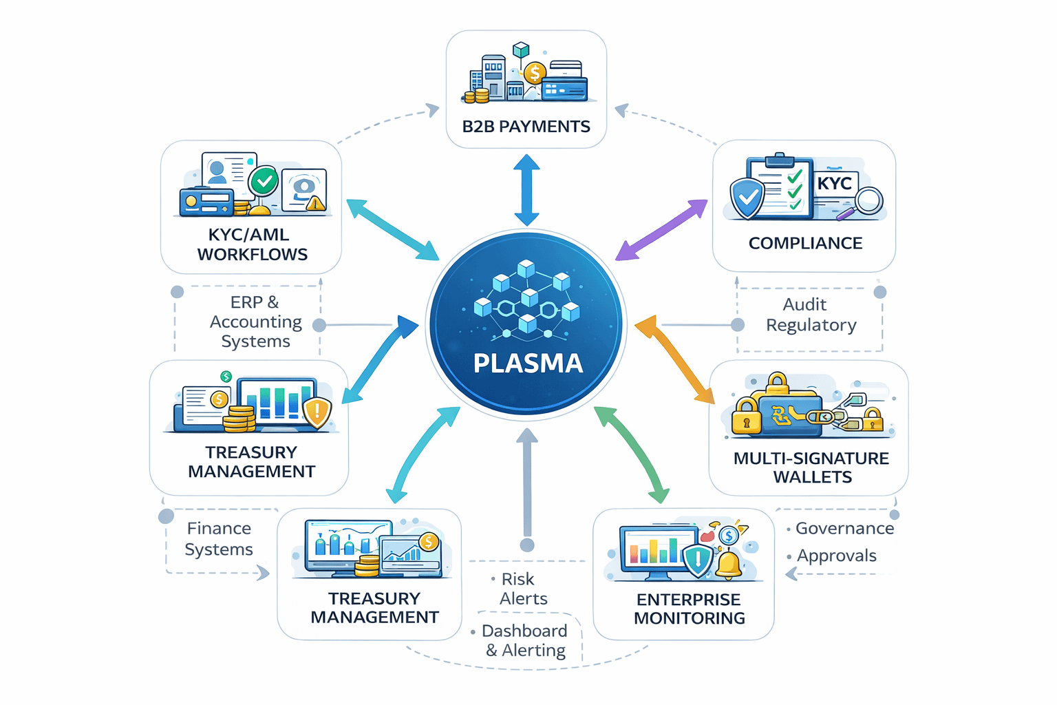 For businesses, Plasma is not just about moving tokens it’s about connecting digital value rails to existing corporate systems. Enterprises already run complex stacks: ERP tools, accounting platforms, compliance engines, treasury dashboards, and monitoring systems. Plasma’s layered structure makes it possible to slot blockchain-based settlement into these environments without forcing companies to rebuild everything from scratch.