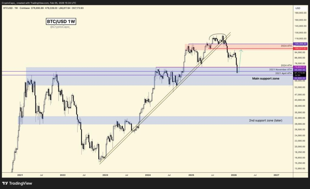 Colegul său comentator de piață, Titan of Crypto, a subliniat că Bitcoin va depăși un decalaj cheie al valorii juste în grafice și a oferit ținte de scădere în jurul valorii de 66,9 mii de dolari, 64,8 mii de dolari și chiar și 59 mii de dolari, dacă presiunea vânzărilor continuă.