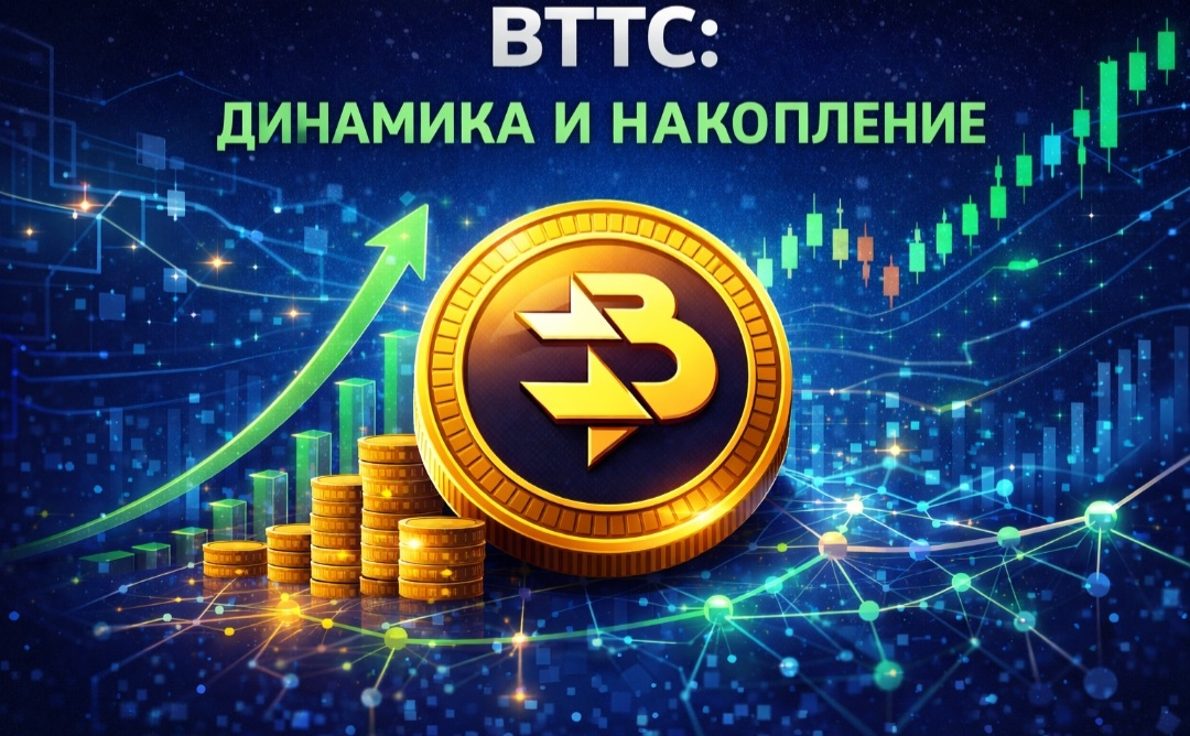 Обложка демонстрирует цифровую блокчейн-сеть с узлами и линиями связи, символизируя кросс‑чейн активность BTTC. В центре размещена стилизованная золотая монета BTTC, выделяющаяся на фоне синего и фиолетового градиента. Справа видны графики и стрелки роста, отражающие динамику цены и накопления токенов. Заголовок «BTTC: ДИНАМИКА И НАКОПЛЕНИЕ» крупным шрифтом подчёркивает тему статьи, а визуальные элементы создают ощущение движения и активности сети.