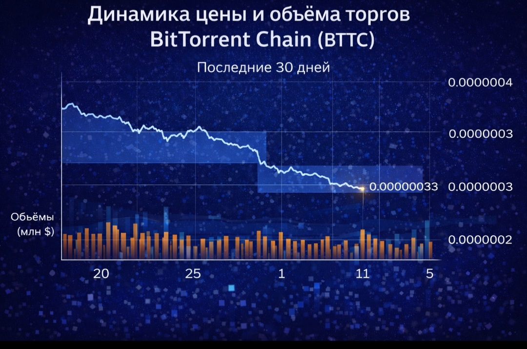 График показывает, что цена BTTC остаётся в узком диапазоне вокруг ~$0.0000003–0.0000004, с умеренными объёмами торгов. Это отражает фазу консолидации рынка после широких колебаний в предыдущие периоды, а также указывает на устойчивость участников в текущем диапазоне цен.