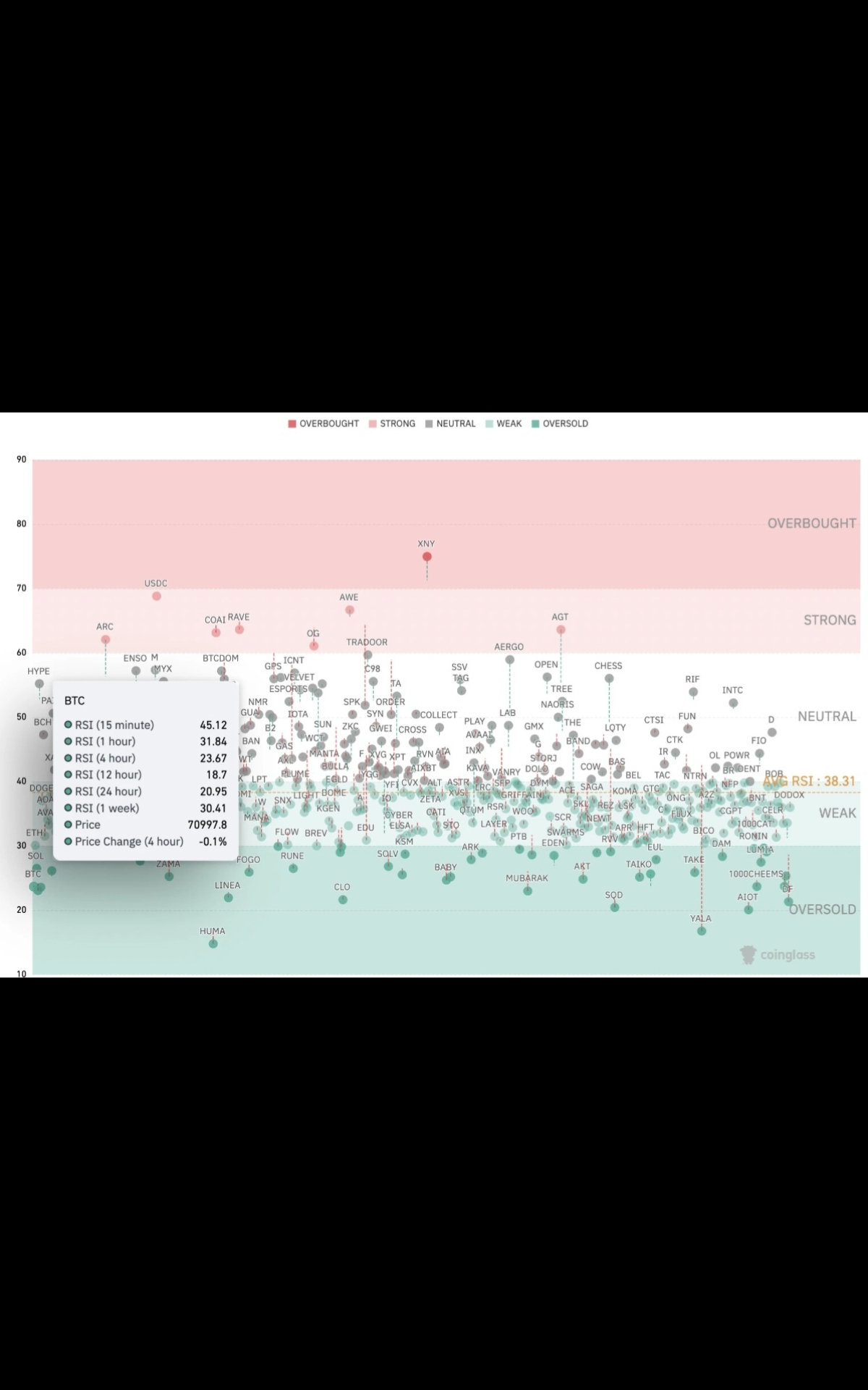 Bitcoin's RSI is now at 18 on the 12-hour chart, 20 on the daily chart and 23 on the four-hour chart. Other intervals also display oversold or near-oversold RSI values, such as 30 and 31 on the weekly and hourly time frames, respectively.