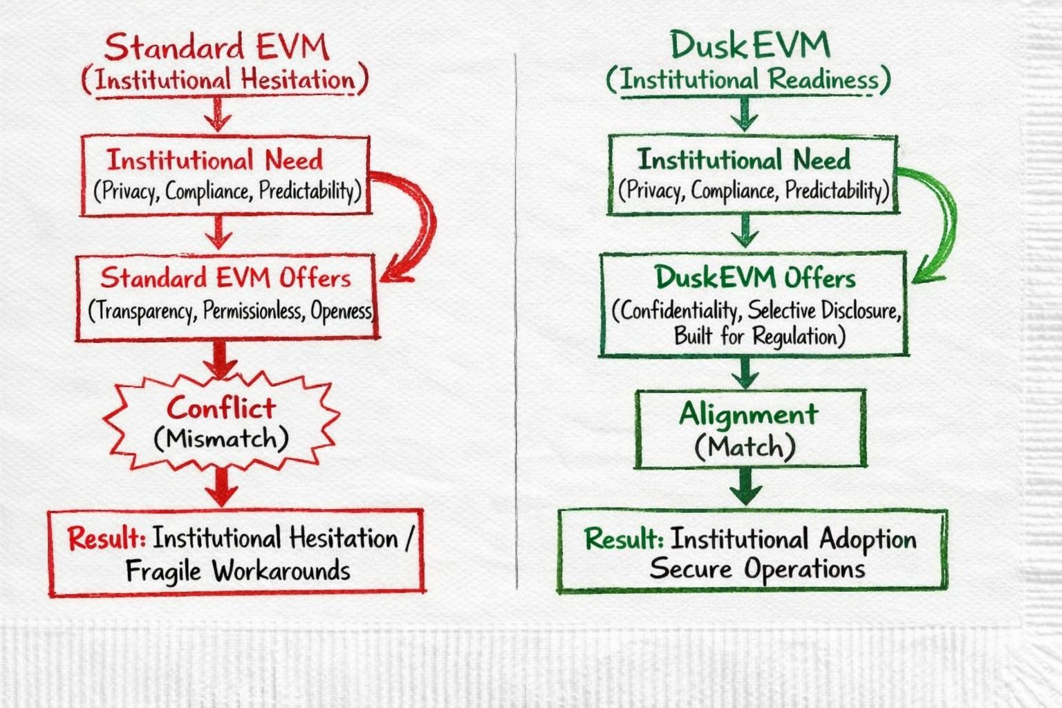 Dusk’s thinking points to a harder truth: if a blockchain isn’t designed with institutional needs in mind from the start, EVM compatibility won't make it suitable. For institutions, the question isn’t “Can we use our contracts here?” It’s “Can we operate here without breaking the rules?”