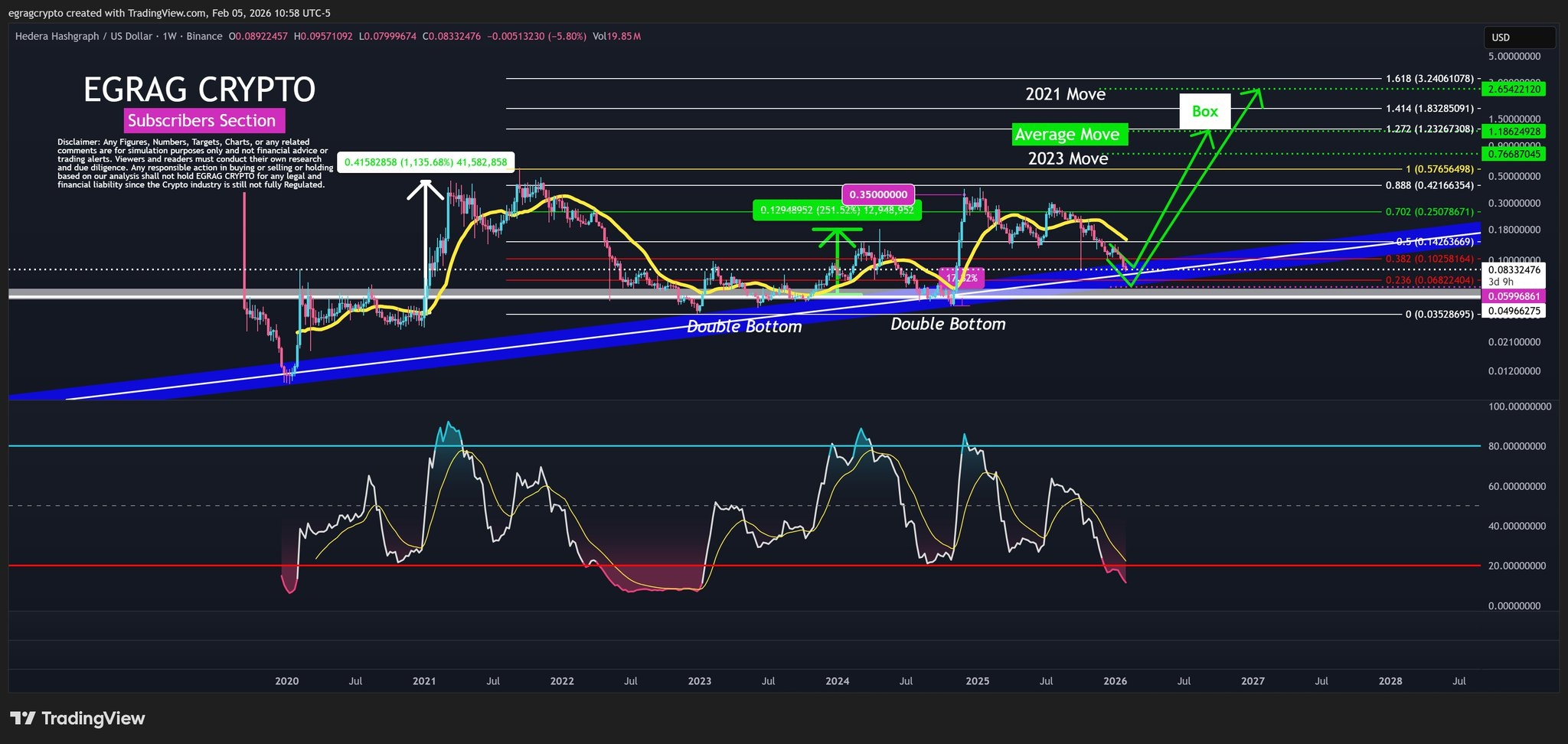 La realidad es que HBAR está ahora mismo en una pelea de titanes entre lo que dice la gráfica y lo que está pasando en las oficinas de los grandes inversionistas. Si miras la imagen que nos compartió el analista EGRAG CRYPTO, hay algo clarísimo: estamos en una zona de "Doble Suelo" (Double Bottom), un patrón que en el mundo del trading suele ser el anuncio de que lo bueno está por venir. Pero ojo, que la cosa no es soplar y hacer botellas.