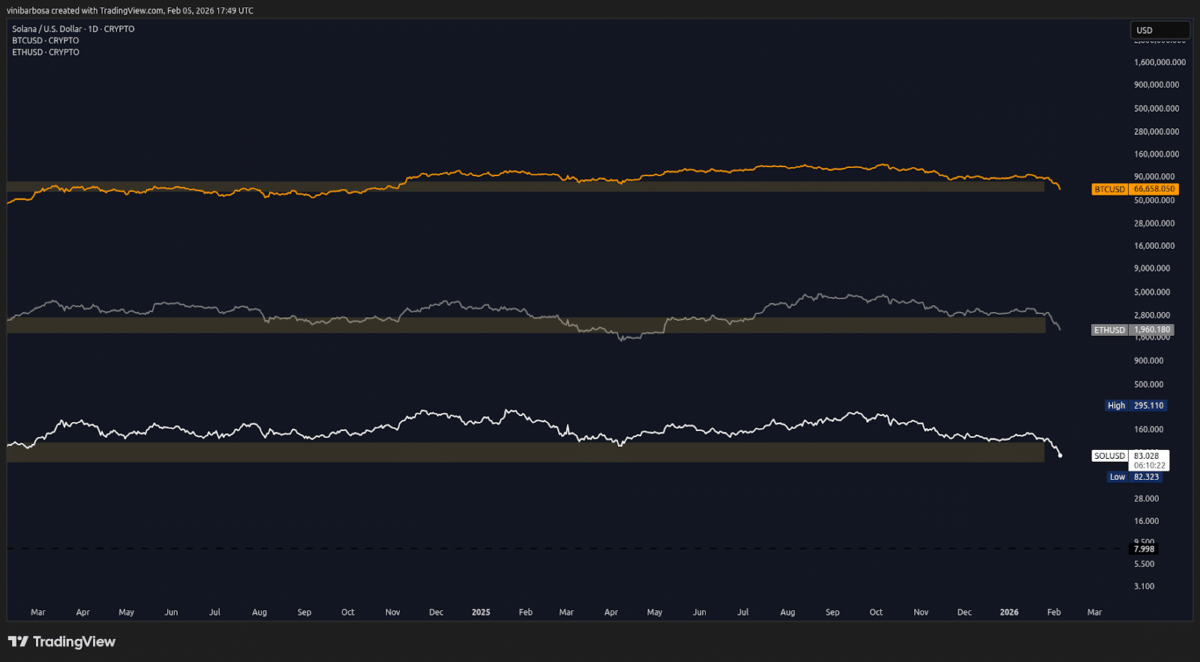 Graficele de preț pentru Bitcoin, Ethereum și Solana 1D, începând cu 5 februarie 2026 | Sursa: TradingView