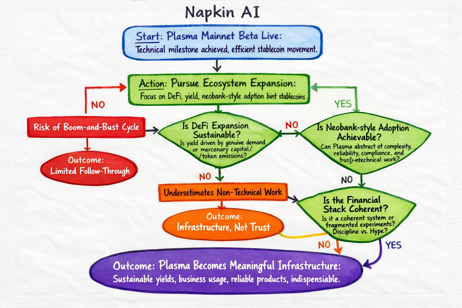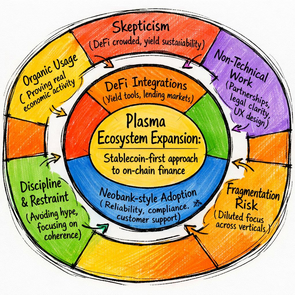 In the crypto space, the idea of ecosystem expansion gets thrown around a lot, but it's rarely examined closely. Almost every project says they're moving beyond just the basics to include things like decentralized finance (DeFi), ways to earn yield, and real-world applications. Plasma is now at this stage, talking more and more about DeFi tie-ins, tools for earning yield, and even adoption similar to online banks using stablecoins. It's an ambitious idea, but is it possible?