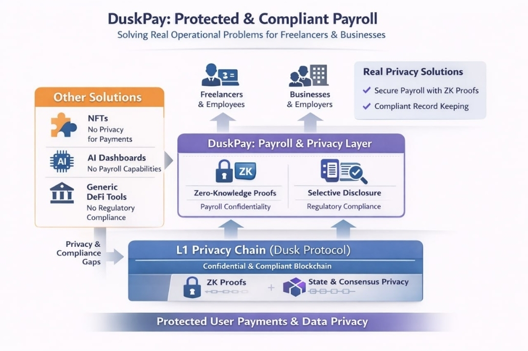 Dusk is purpose built for financial privacy and regulatory compliance, the space is virtually empty. This is when the concept crystallized. An unhindered by PII payroll system for freelancers.