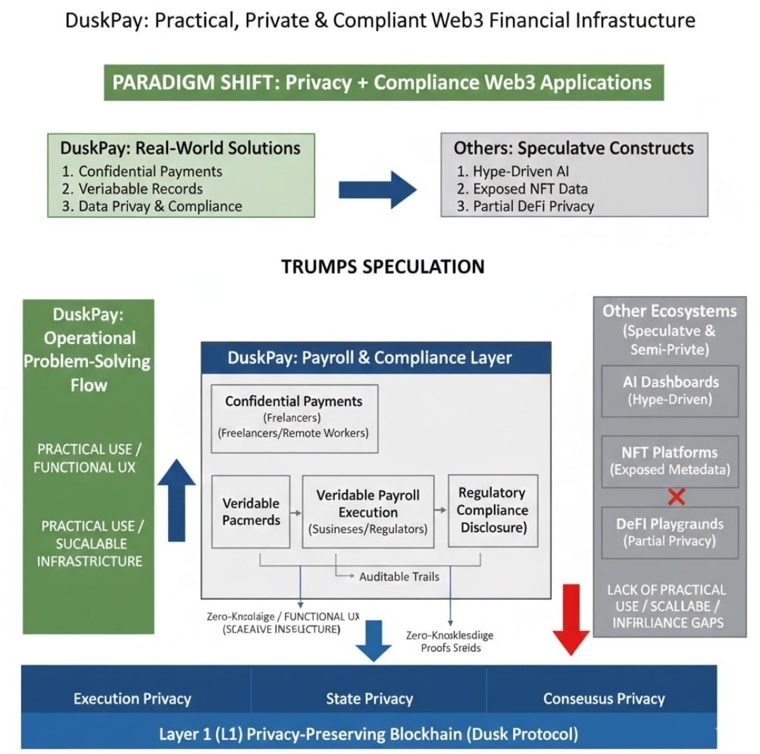 Judges, institutions, and developers will understand the point. The lessons of the overhyped AIs, the semi-private DeFi and the NFT with exposed metadata, teach us that operational solutions trump speculative constructs every time. DuskPay is not a speculation. It is a paradigm shift in the financial infrastructure.