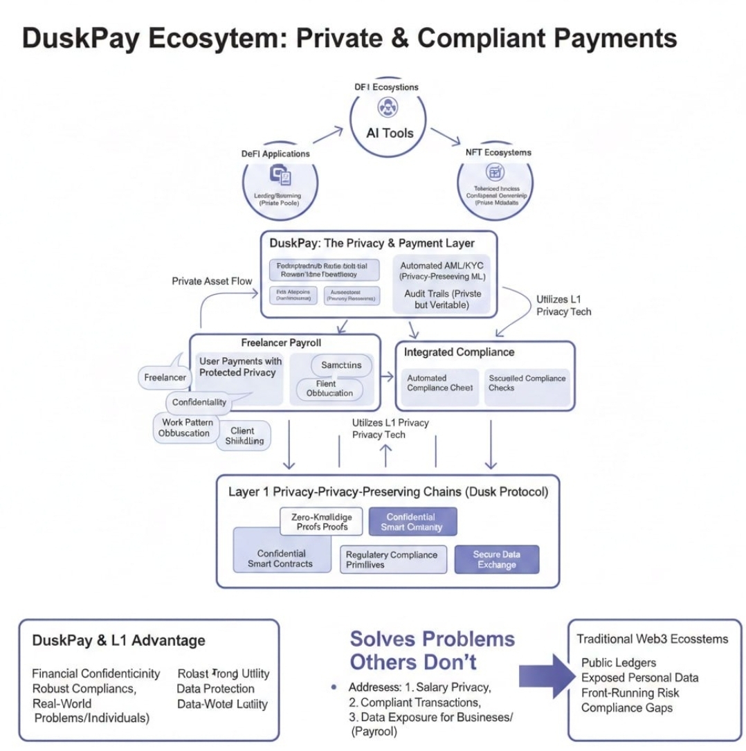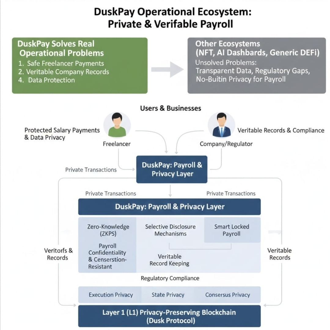 Dusk's simple architecture fits right in. It merges privacy at execution, state and consensus layers with selective disclosure. Verifiable but amount and recipient obscuring Zero-knowledge proofs censorship smart contracts are locked payroll without revealing data, While records. Virtually no payroll is able to be reconstructed or be able to be inferred from malicious persons from a transaction in a node or wallet. DuskPay is solving a real operational problem, unlike the rest of the market chasing AI dashboards and NFT badge overlays.