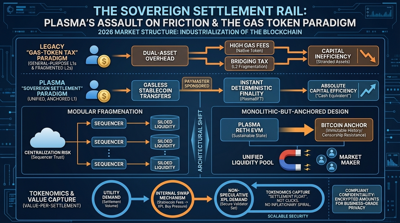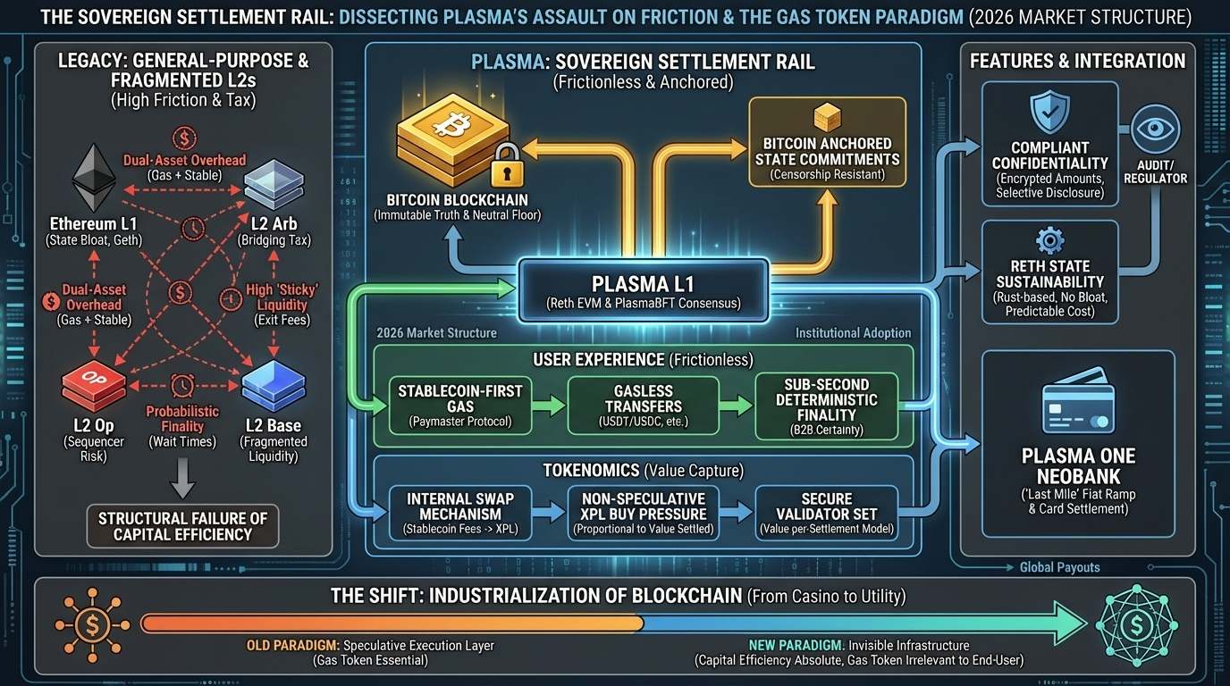 Plasma. The most significant shift in the 2026 market structure is not the rise of a new asset class, but the quiet, systematic dismantling of the gas-token tax in global financial settlement. For years, the crypto industry operated under the delusion that a general-purpose "world computer" could also serve as an efficient payment rail, ignoring the fundamental reality that high-velocity commerce cannot survive on infrastructure that requires a dual-asset overhead. Every participant who has ever been stranded with a thousand dollars in stablecoins but zero in native gas tokens knows this isn't just a UX hurdle it is a structural failure of capital efficiency. Plasma is the first credible attempt to unbundle the settlement layer from the speculative execution layer, treating the stablecoin not as a guest on the network, but as its primary reason for existence.