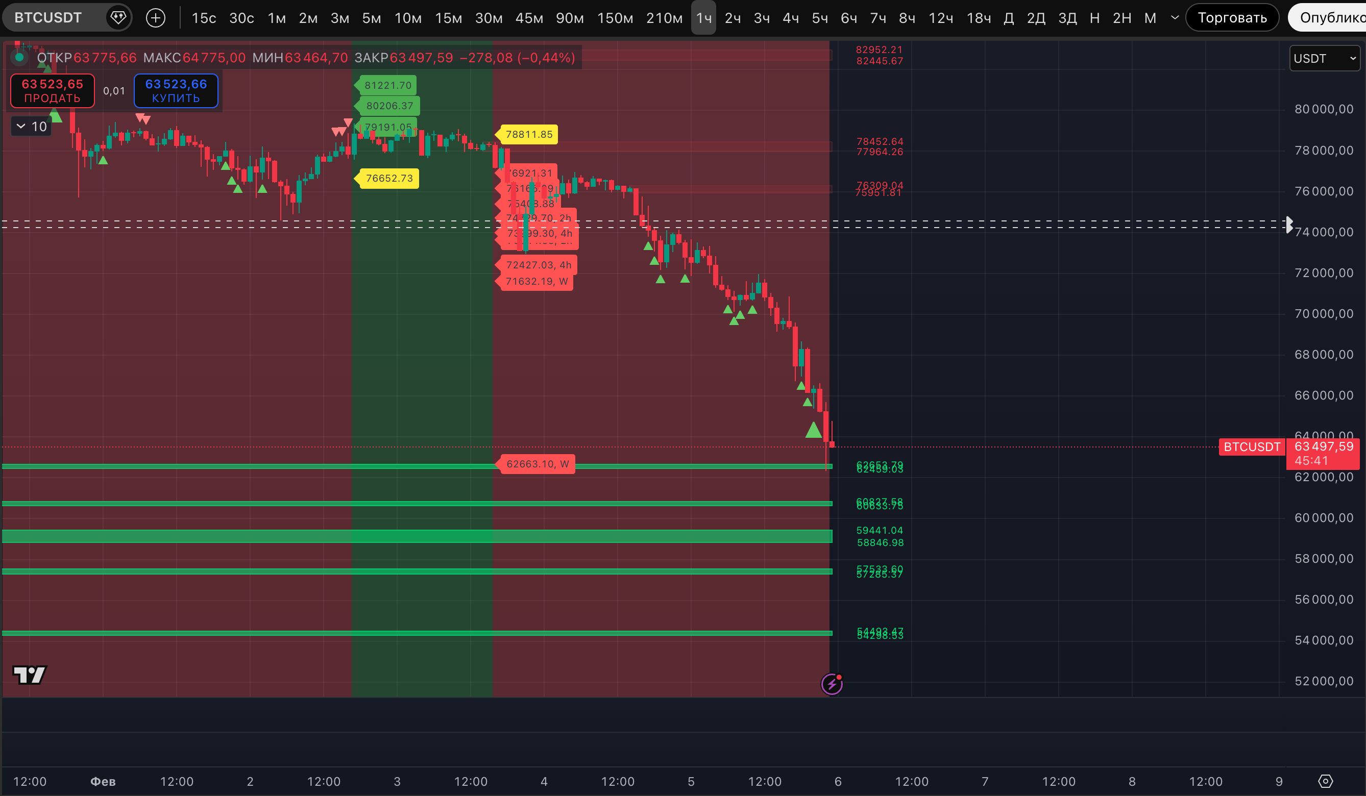 Добавим, что по уровням ликвидности цена дошла до зоны 62 459-62 652$, "сбрив" все ликвидности на пути. Еще в начале 5 февраля при курсе 73 000$ это казалось чем-то далеким.