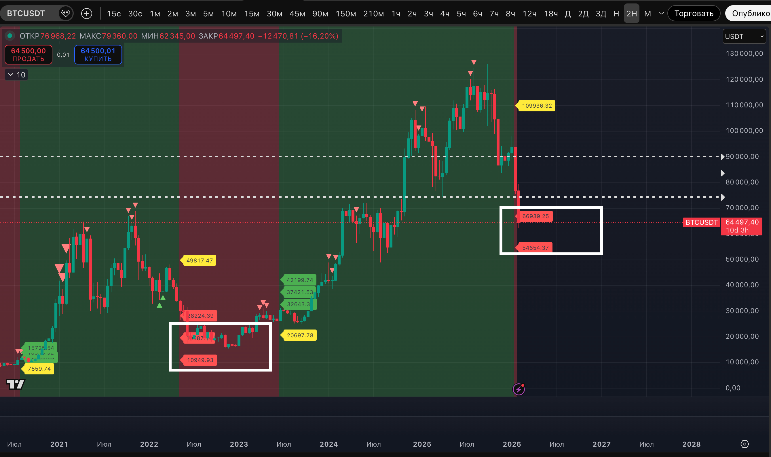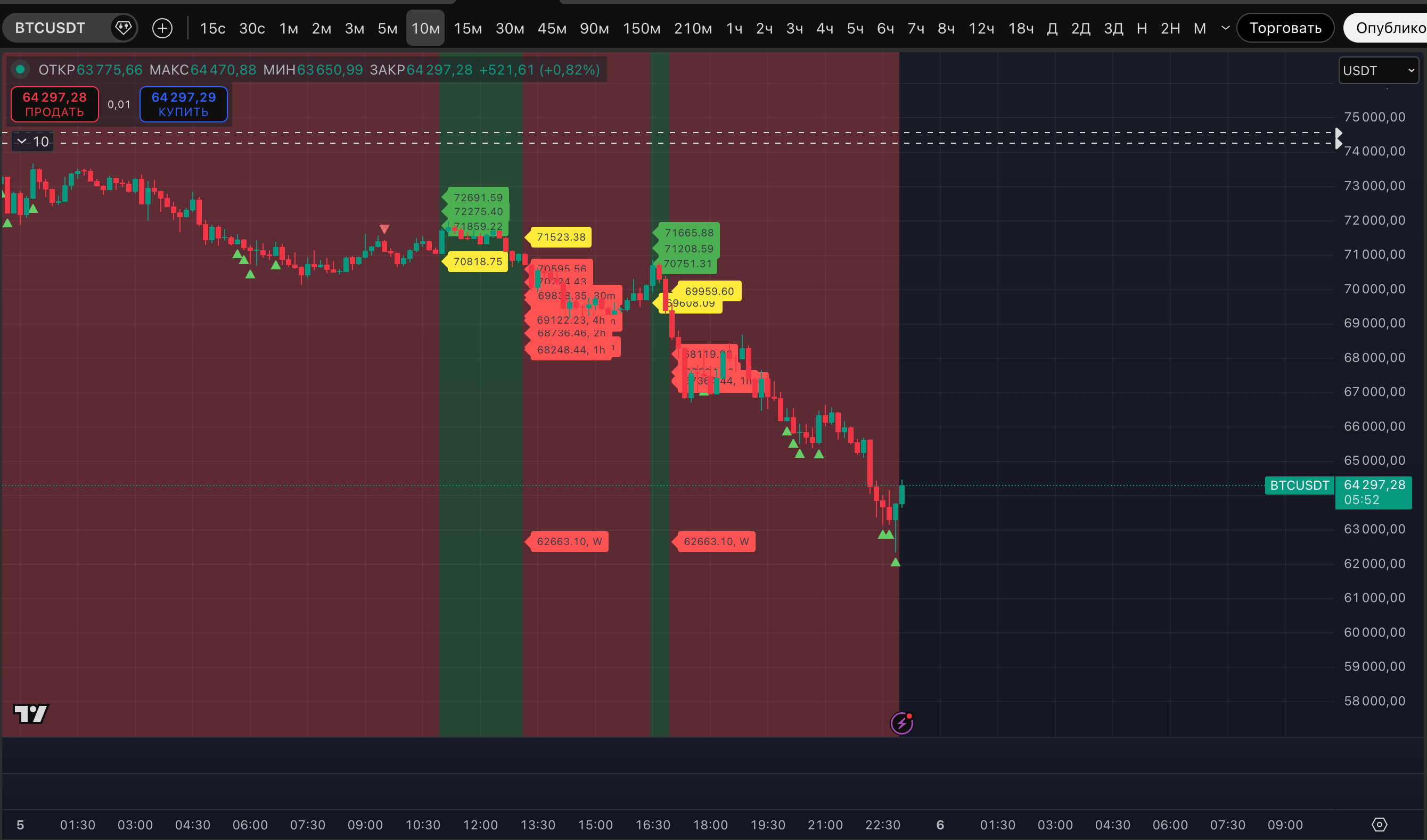 "... Есть, конечно, внизу еще одинокая цель 62 633$, она с недельного ТФ и она единственная оставшаяся. На сейчас конкретно для этого дампа это максимальная цель по волатильности..."