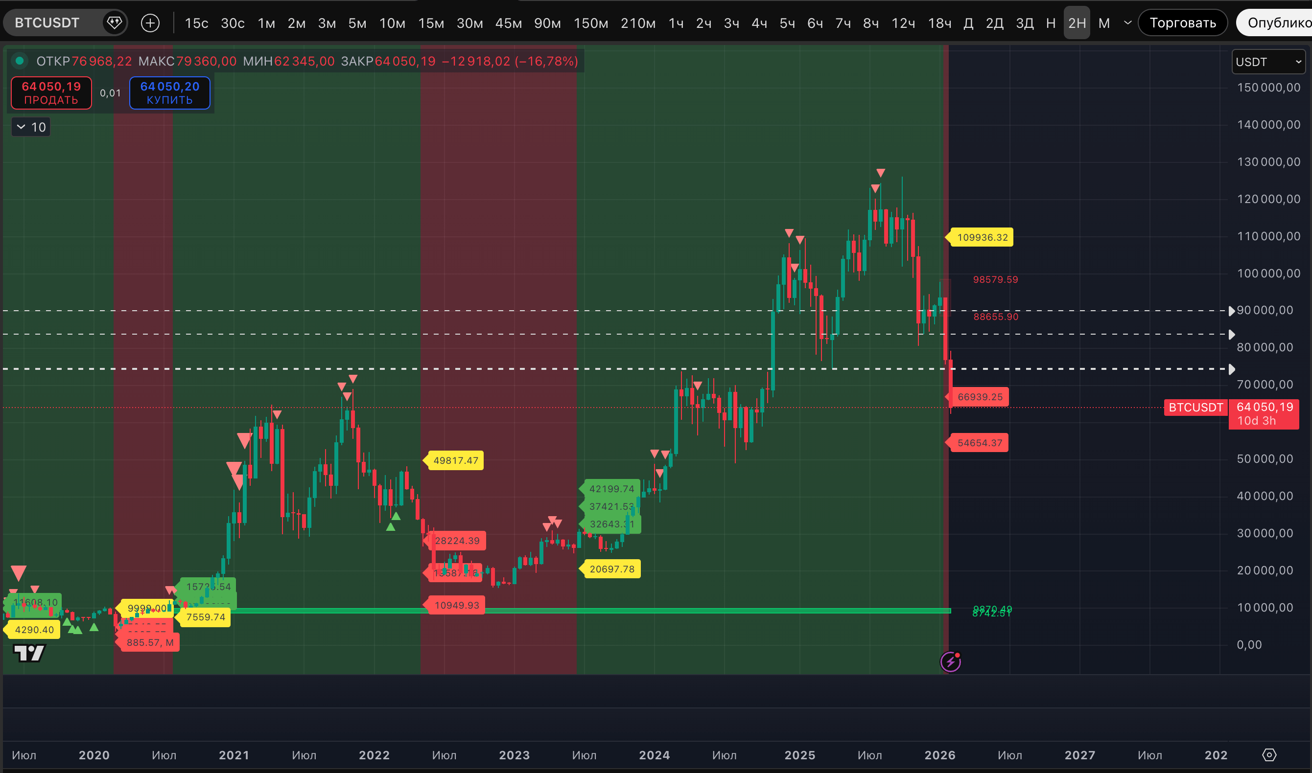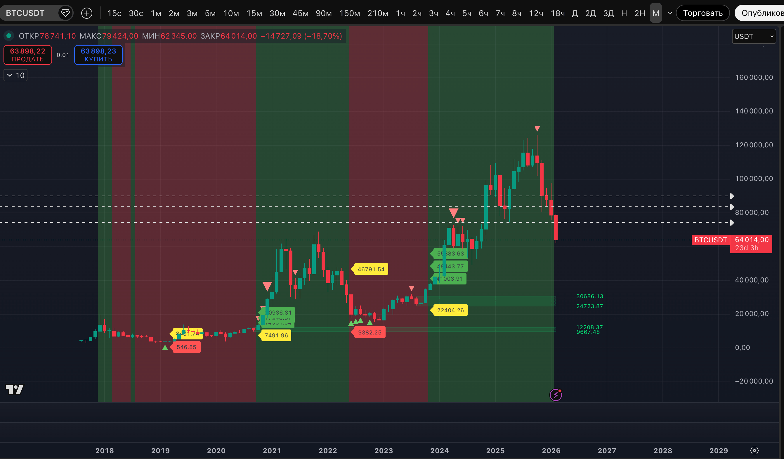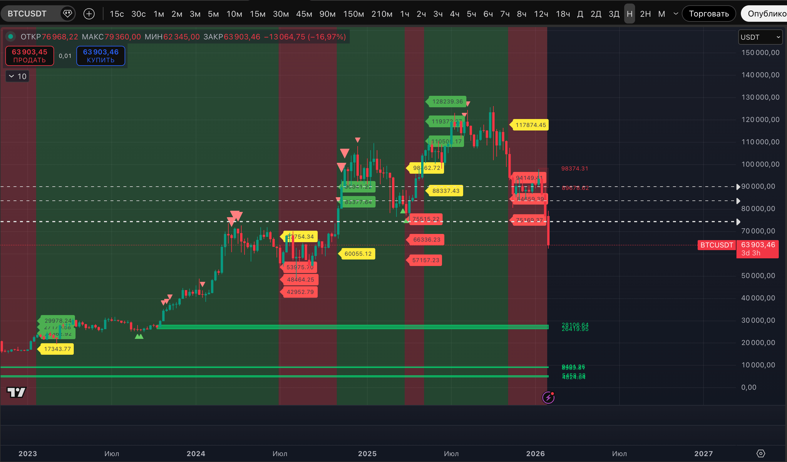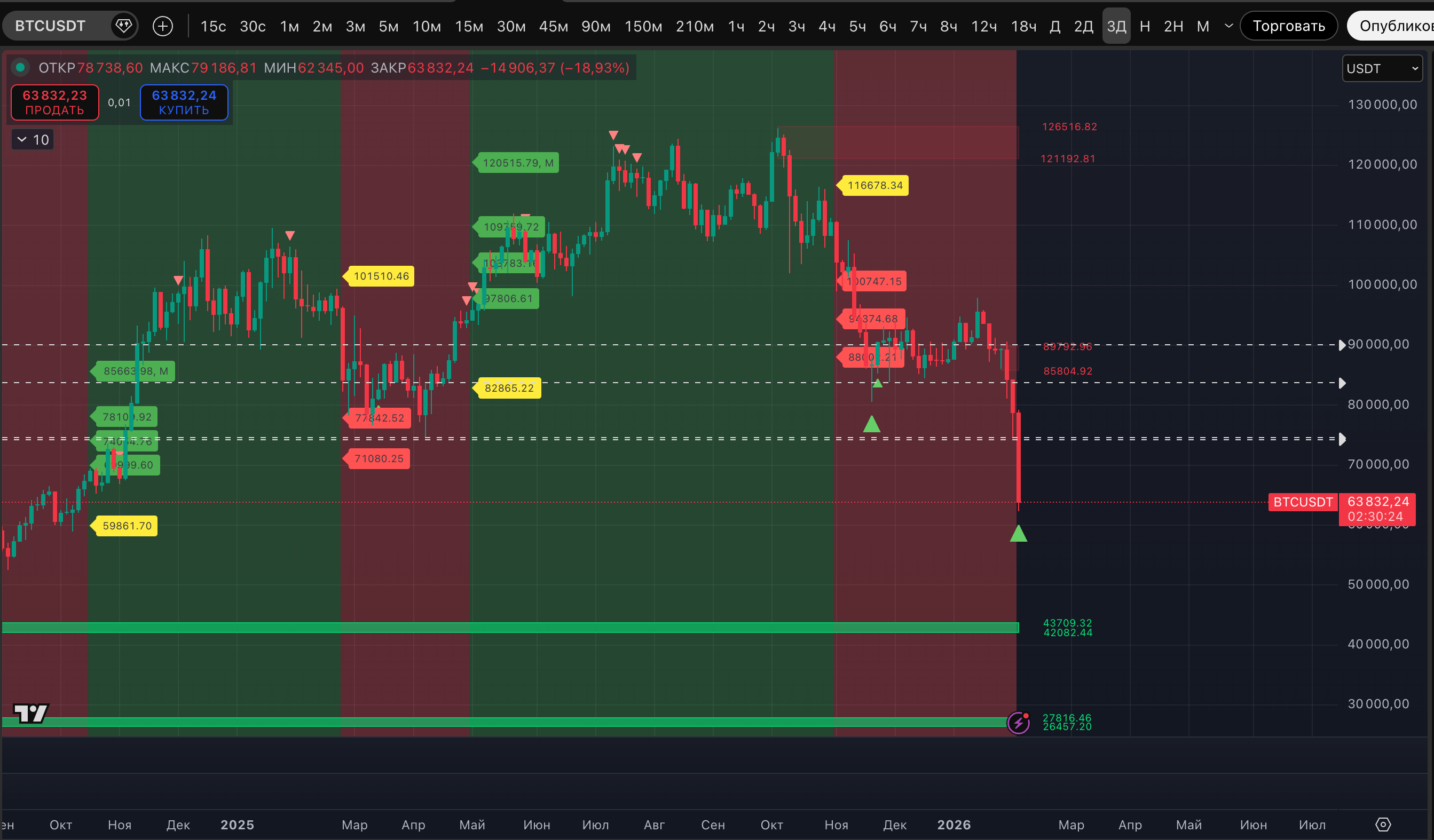 Чего не хватает теперь? С точки зрения "толпа всегда ошибается" / "толпе не дадут заработать". Идеально выбритых медведей, поверивших в то, что они в своих широтах до 2027. Снижение до диапазона 70 000-80 000$ еще можно было оценить как момент, где начнется отскок и бычья ловушка. Теперь снова больше в голове мысли о ловушке медвежьей.