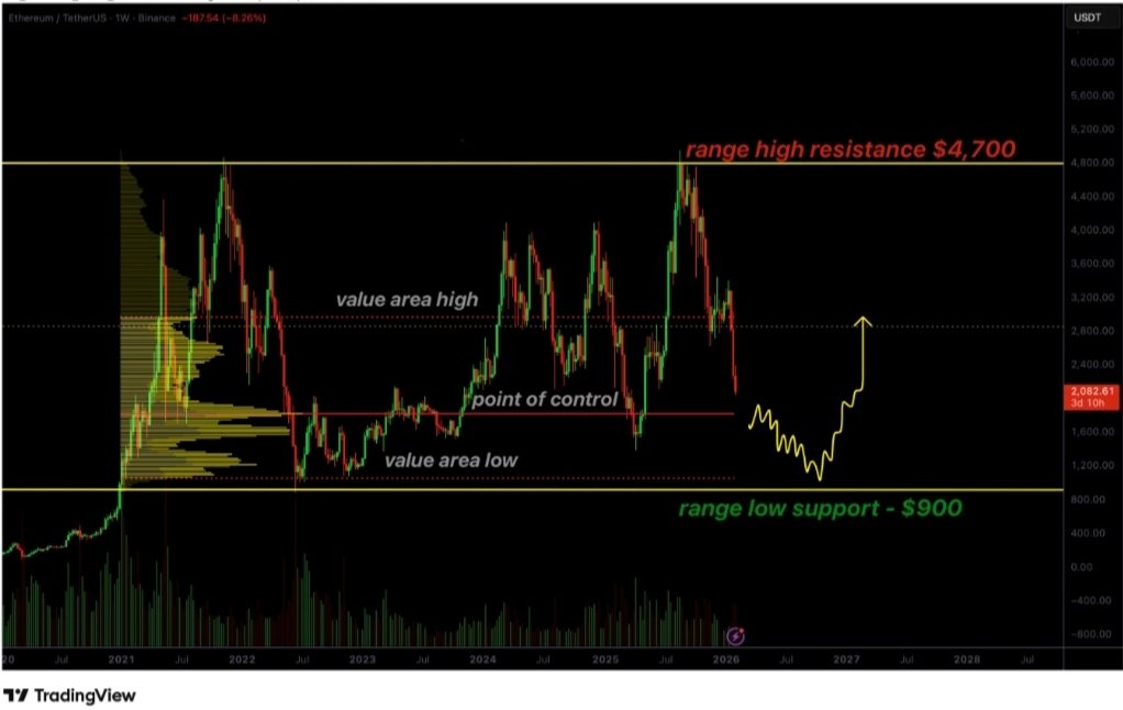 Technically, Ethereum appears to be undergoing a high-timeframe range rotation rather than a structural collapse. As long as the broader range remains intact, a test of $900 remains plausible and may provide the conditions needed for a local bottom.