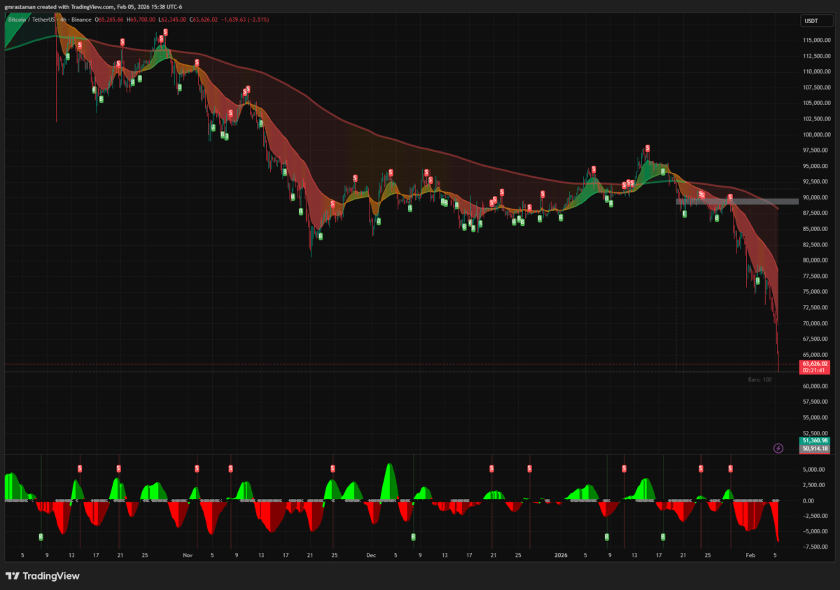 Sesiunea de tranzacționare de miercuri s-a transformat într-un masacru pentru piețele cripto, amplificând problemele Strategiei. Bitcoin BTC 63 911 24h volatilitate: 12,1% Capitalizare de piață: 1,28 T Vol. 24h: 140,30 B a scăzut de la aproape 73.3400 la un minim intraday de 62.345—cel mai slab nivel din noiembrie 2025. Graficul pe oră arată vânzări necruțătoare care au distrus fiecare nivel de suport intermediar, cu prețuri care au pierdut peste 25.000 de dolari de la maximele din ultimele trei luni. Declinele zilnice au depășit 12,80%, captând nenumărați investitori în poziții sub apă și declanșând lichidări în cascadă pe piețele derivate.